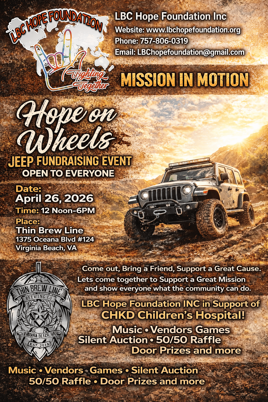 *$100.00 Donation (Craft Vendors & Small Business/Cottage Bakers) : Vendor Booth Space 6x6 no bigger than 8x8 which gives you 25 Entries into our Jeep Giveaway Event that we will be hosting on a later date in support of CHKD Children’s Hospital. Your Business mentioned on our Facebook page as a Vendor for the event at Thin Brew Line.
